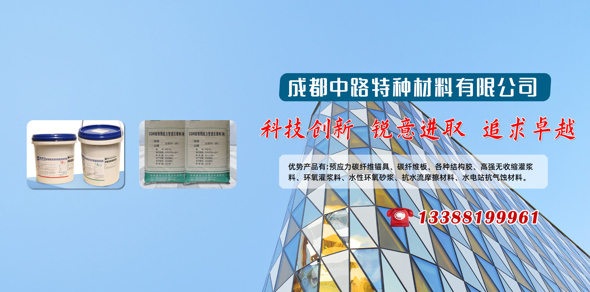 成都中路特種材料有限公司借助清華大學(xué)高分子材料學(xué)科、晨光化工研究院、西南交通大學(xué)、四川交通職業(yè)技術(shù)學(xué)院科研技術(shù)平臺(tái)成為一家集新材料研發(fā)、銷售、技術(shù)服務(wù)和施工于一體的專業(yè)服務(wù)公司,優(yōu)勢(shì)產(chǎn)品有:預(yù)應(yīng)力碳纖維錨具、碳纖維板、各種結(jié)構(gòu)膠、高強(qiáng)無(wú)收縮灌漿料、環(huán)氧灌漿料、水性環(huán)氧砂漿、抗水流摩擦材料、水電站抗氣蝕材料和研發(fā)各種特殊用途膠黏劑產(chǎn)品地處西南腹地成都,業(yè)務(wù)覆蓋四川各大中小城市、重慶、云南、昆明、新疆、西藏等區(qū)域。產(chǎn)品涵蓋各種加固施工材料、施工設(shè)備及施工配件,品牌有威士邦等aa進(jìn)口品牌,同時(shí)批發(fā)銷售國(guó)產(chǎn)高、中、低端品牌,為客戶提供全面參考。 成都中路特種材料有限公司為您提供加固行業(yè)的一站式服務(wù)! 如果您面對(duì)建筑物加固,不知如何下手,我們將針對(duì)您的項(xiàng)目情況,提供全面的技術(shù)指導(dǎo)咨詢,甚至為您量身定做加固方案;如果您面對(duì)項(xiàng)目要求,不知如何購(gòu)買加固材料,我們將根據(jù)您的需要,提供多種參考,從進(jìn)口品牌、國(guó)內(nèi)知名品牌到低端產(chǎn)品,一應(yīng)俱全; 如果你萬(wàn)事俱備,不知何處尋找施工人員,我們可以為您提供具有多年加固經(jīng)驗(yàn)的專業(yè)隊(duì)伍;中路特種材料致力于為客戶提供全方位的建筑物加固解決方案。 成都中路特種材料有限公司是一座橋,一座連接廠家與用戶的橋,以質(zhì)量求生存,以信譽(yù)圖發(fā)展,成都中路特種材料有限公司期望用真摯的服務(wù)筑起一座客戶信任之橋。   科技創(chuàng)新 銳意進(jìn)取 追求卓越!        熱忱歡迎業(yè)內(nèi)專業(yè)人士加盟合作!